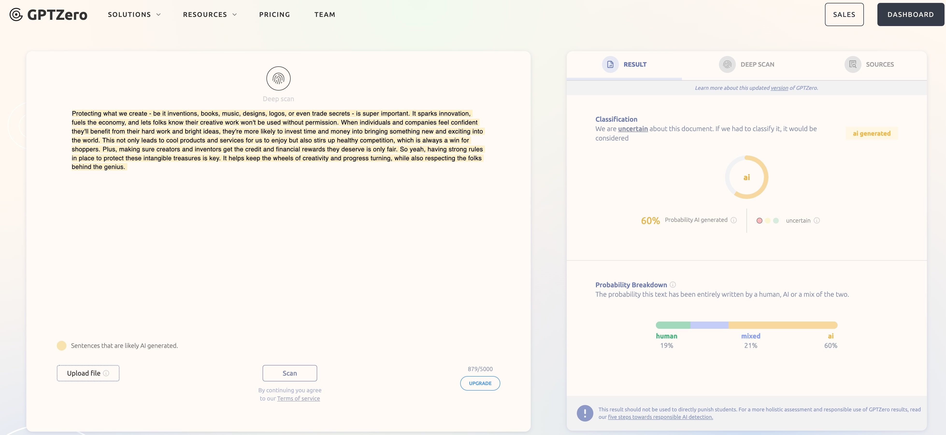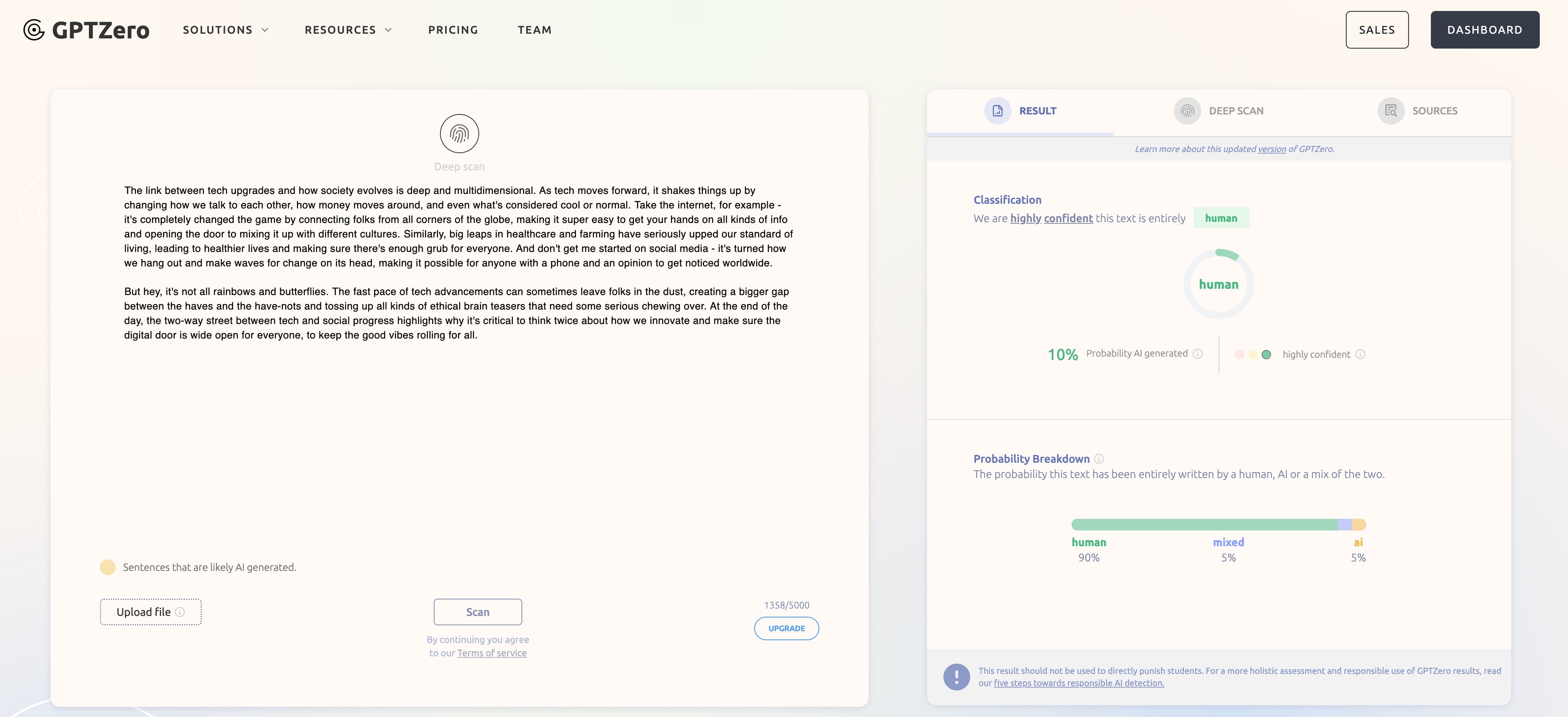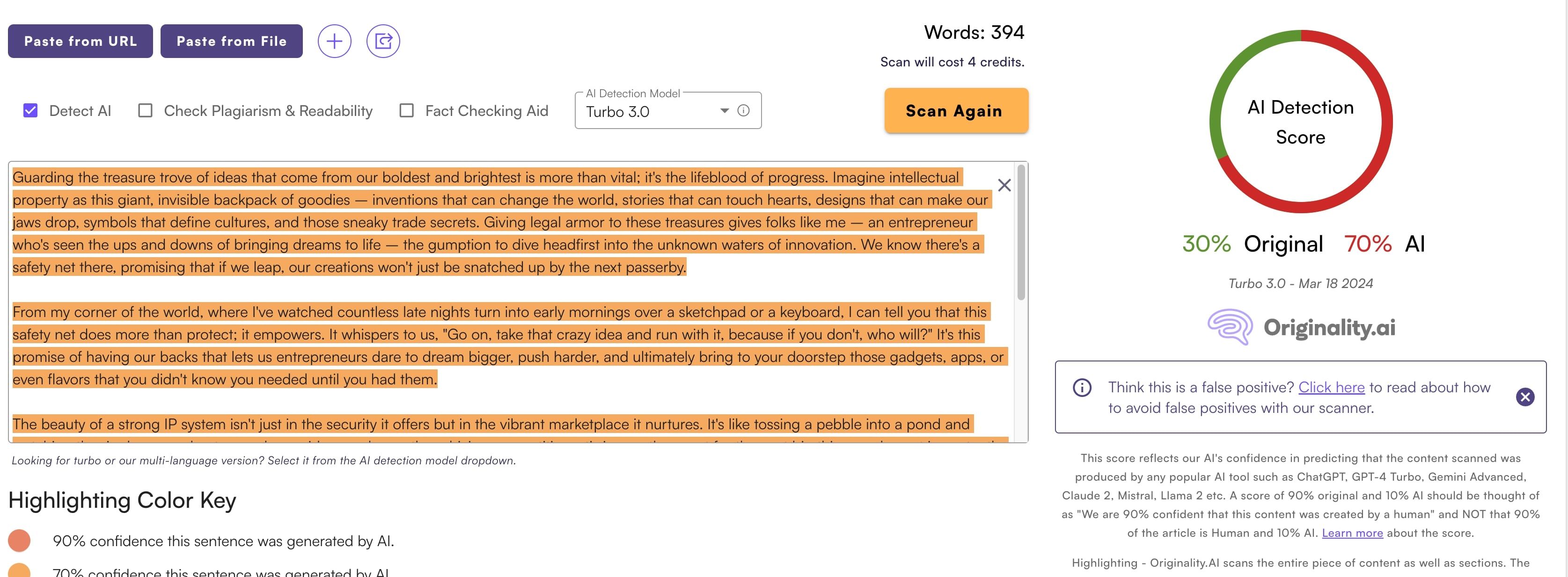 From the results, we can clearly see that this method does not work well for the first paragraph, getting high AI scores from both of the AI detectors. However, this approach does work for the second paragraph, getting an impressive 42% AI score from GPTZero, and a 70% AI score from Originality.ai.