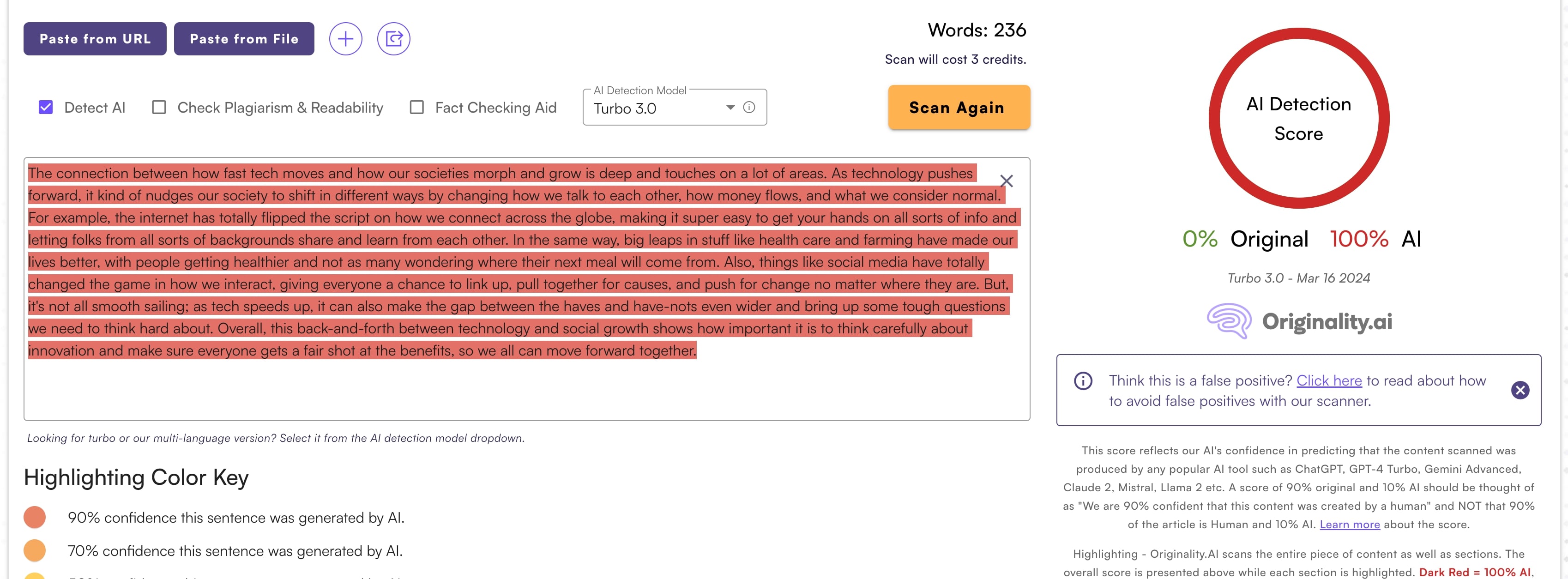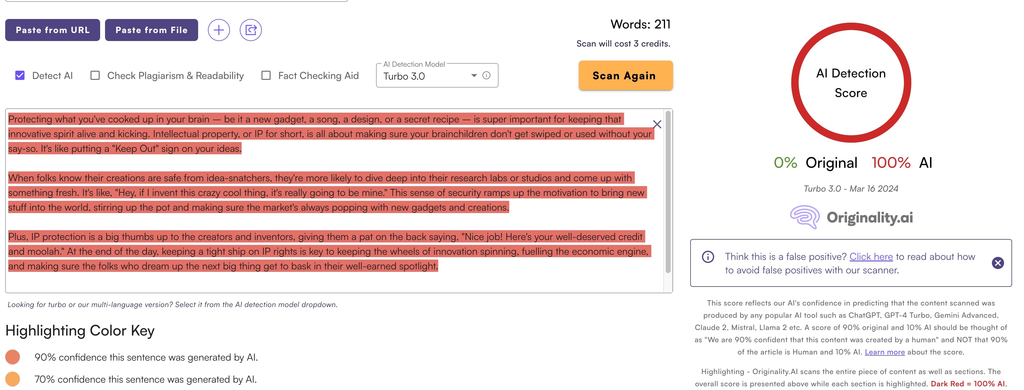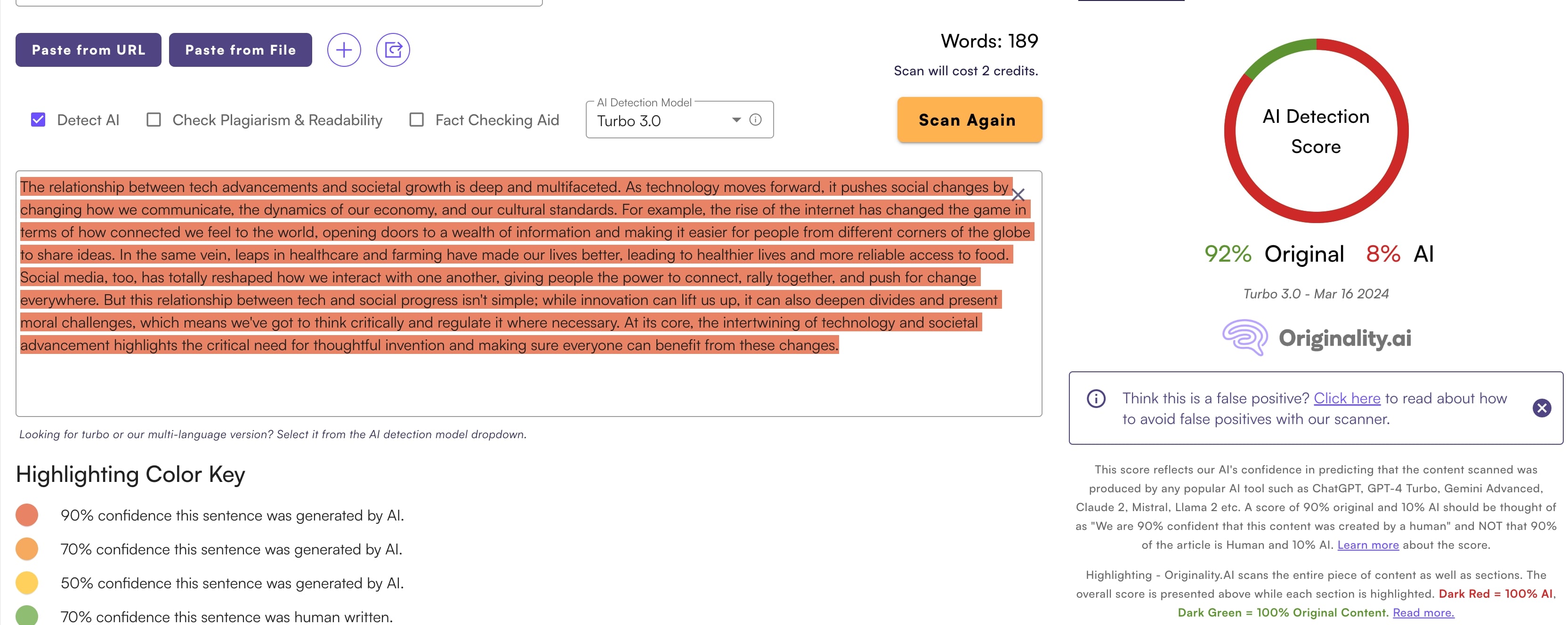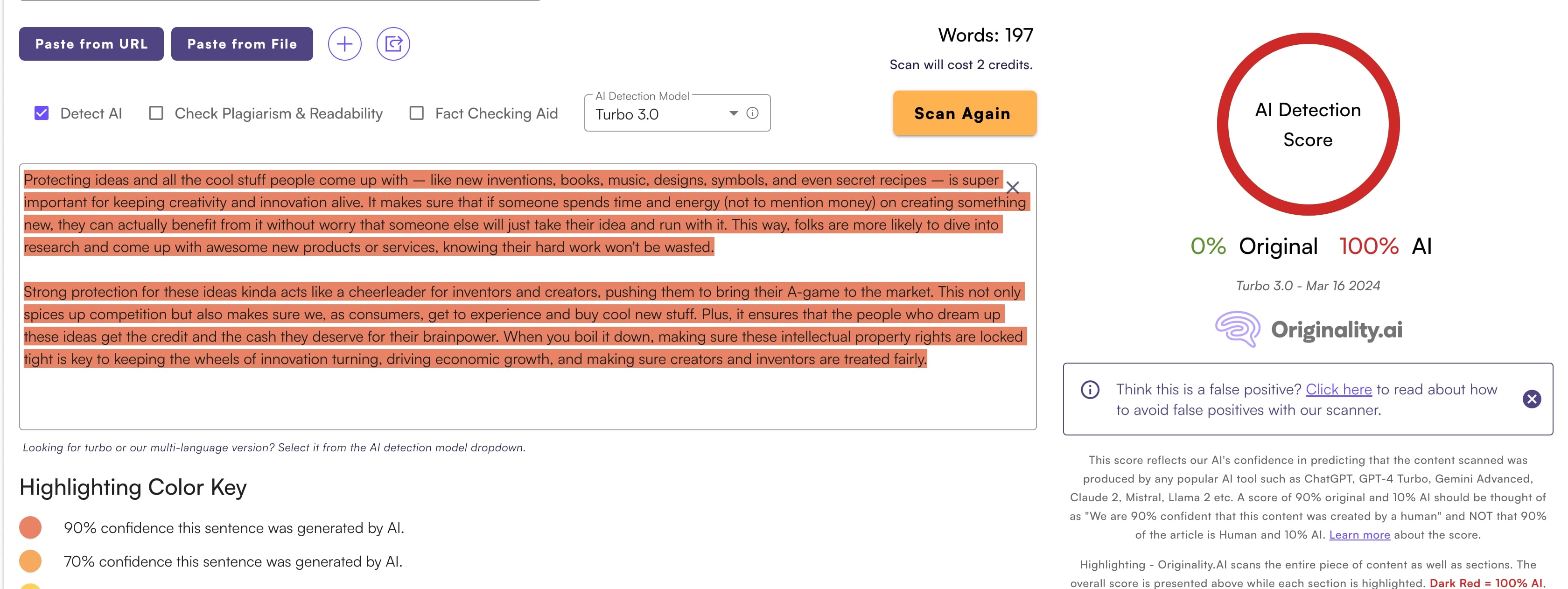 When looking at the results from Originality.ai, it may seem like the same “fully AI-generated” situation appears again. But please notice the color of the text. Originality is marking the “errored” text with a slightly lighter red (not that AI-like) compared to the previous dark red (100% fully AI-generated).
